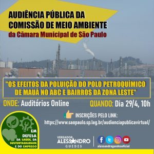 Uma Audiência Pública virtual vai discutir as consequências da poluição e contaminação pelo Polo Petroquímico do Grande ABC, que fica entre Santo André e Mauá.