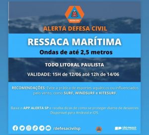 A recomendação é para que moradores e turistas da região evitem a prática de esportes aquáticos no período em que o mar estará revolto