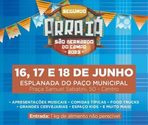Comidas típicas, food trucks e apresentações musicais. Sexta tem tributo a Raul Seixas. ARRAIÁ DE SÃO BERNARDO 2023LOCAL: ESPLANADA DO PAÇO MUNICIPALDATA: 16, 17 E