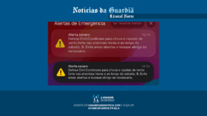 Mensagem de emergência foi disparada às 19h58; temporais e rajadas fortes são esperadas até sábado (8). A Defesa Civil do Estado enviou alerta severo via