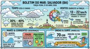 Previsão do Tempo A terça-feira em Salvador é marcada por céu com muitas nuvens e possibilidade de chuvas rápidas e isoladas durante a manhã, tarde