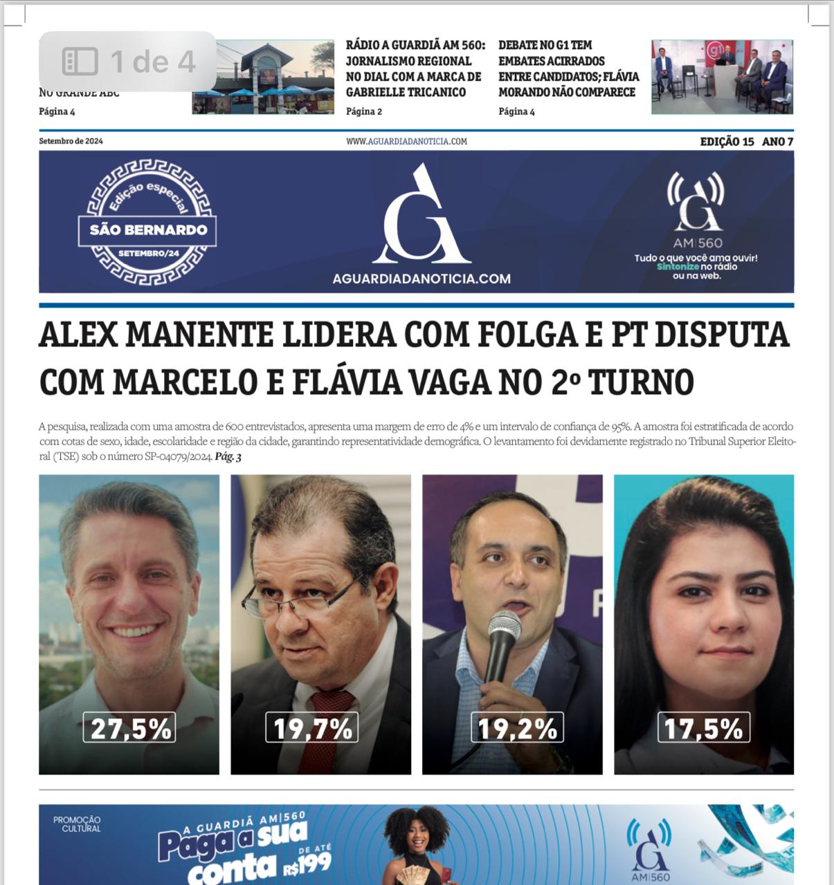 Os eleitores de São Bernardo do Campo poderão acompanhar todas as informações detalhadas sobre essa pesquisa na edição de setembro do jornal A Guardiã da Notícia, que será distribuído gratuitamente em toda a cidade. O jornal trará não apenas os dados completos do levantamento eleitoral, mas também uma análise sobre o recente debate transmitido pelo G1, que contou com a participação de Alex Manente, Luís Fernando e Marcelo Lima. A ausência de Flávia Morando, que mais uma vez não compareceu ao debate, foi explorada pelos adversários.