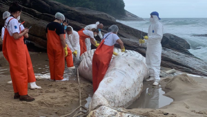 Uma baleia-jubarte medindo cerca de 8,4 metros de comprimento, foi encontrada morta pela equipe do Projeto de Monitoramento de Praias da Bacia de Santos (PMP-BS)