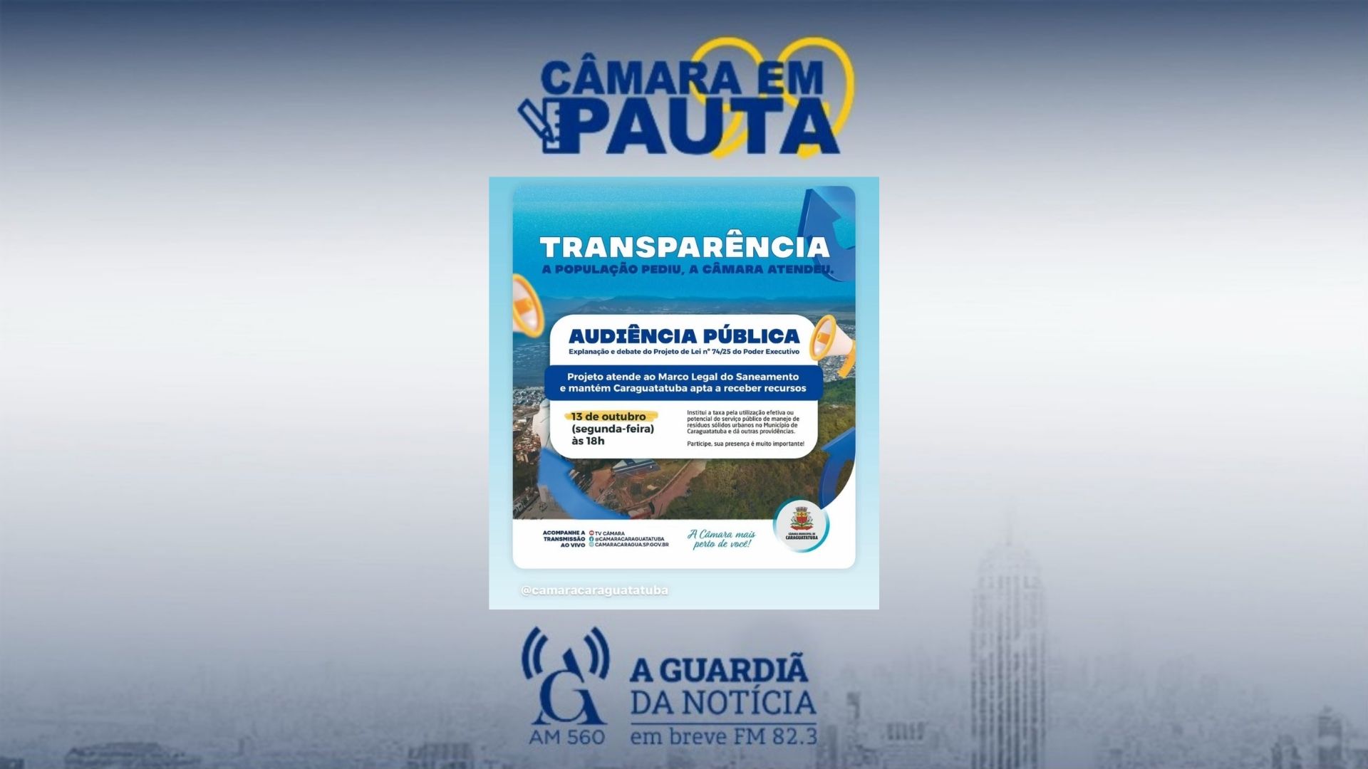 A Câmara Municipal de Caraguatatuba realizará, no dia 13 de outubro, às 18h, a terceira audiência pública para discutir o Projeto de Lei nº 74/25, de autoria do Executivo, que propõe a criação da Taxa de Manejo de Resíduos Sólidos Urbanos (TMRSU). A decisão foi motivada pela ampla participação popular registrada nas duas primeiras reuniões, que reuniram moradores, vereadores e técnicos da Prefeitura em longos debates sobre o tema .