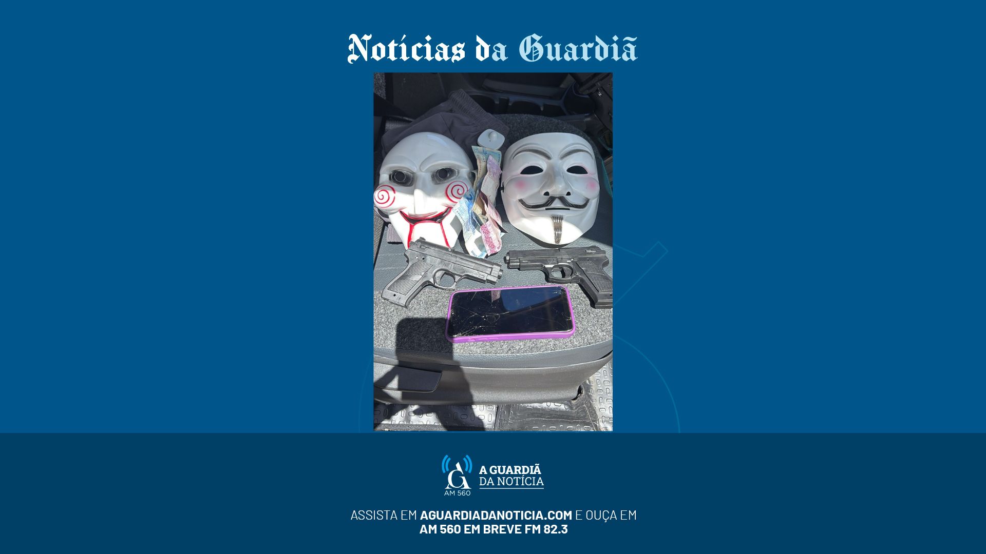 Durante a busca pessoal, nada de ilícito foi encontrado, mas o detido indicou o local onde havia escondido uma sacola com máscaras e simulacros de arma de fogo usados no crime.