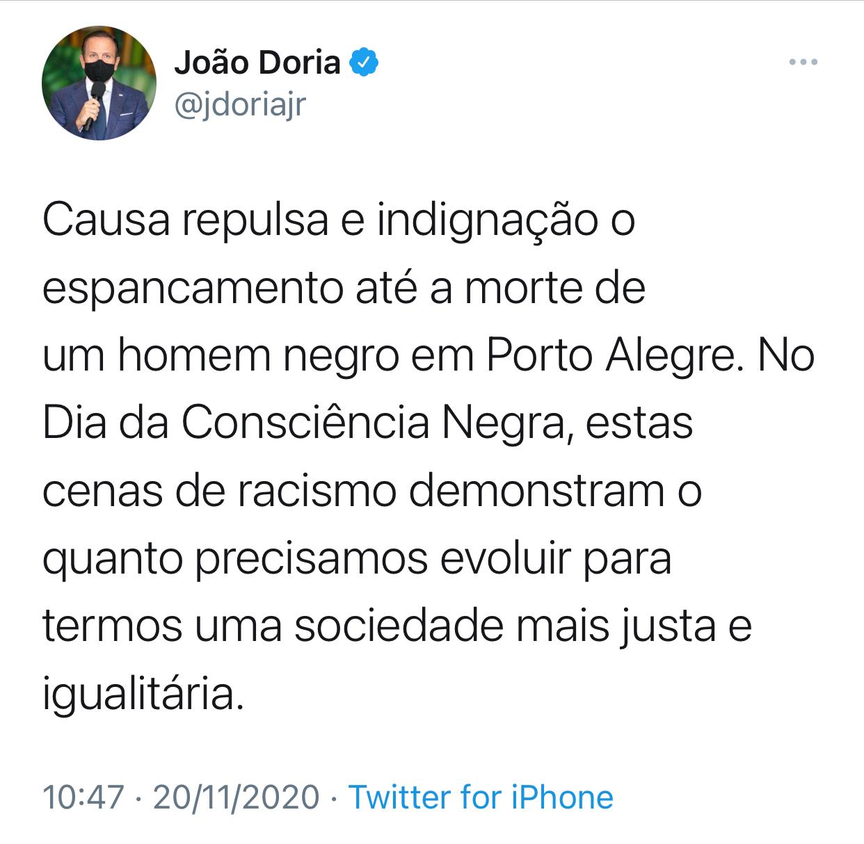 Governador do estado de São Paulo fez um post em seu twitter sobre o Dia da Consciência Negra e comentou sobre o caso.