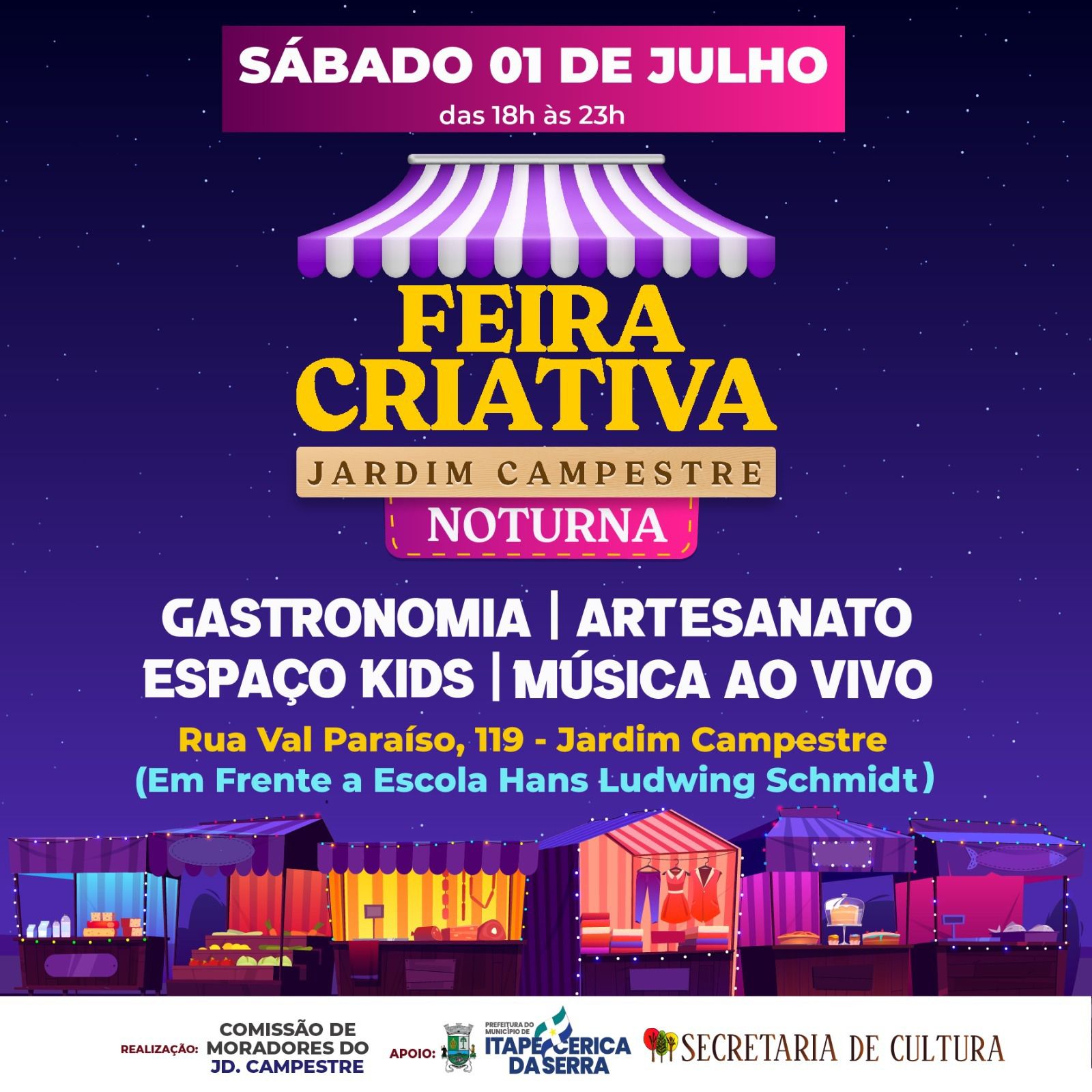 O evento no Jardim Campestre, começa às 18:00 e terá uma ampla gastronomia, feira de artesanatos, espaço kids e música ao vivo.
