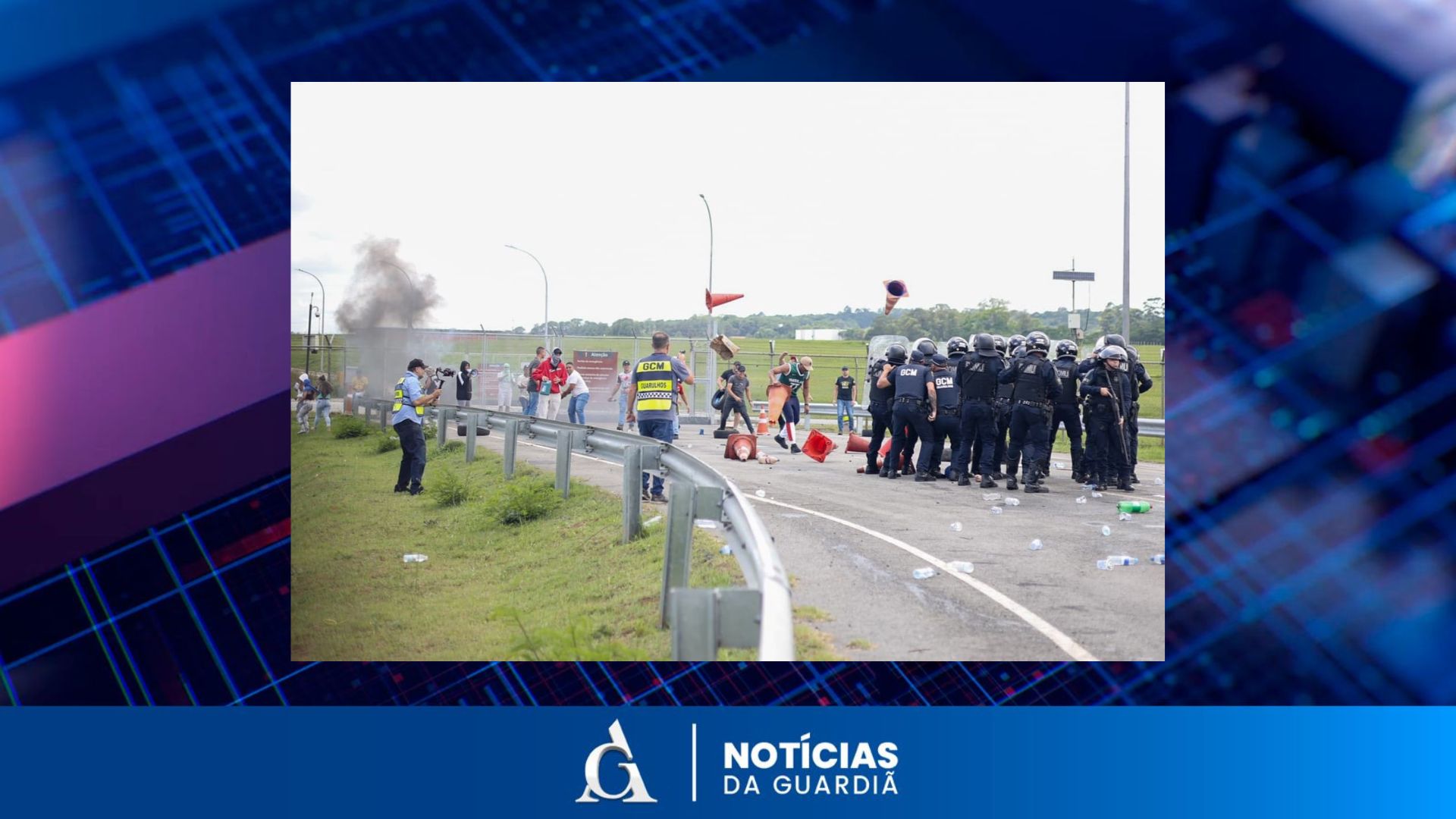Vinte GCMs recém formados, atuaram como manifestantes, colocando bombas de fumaça em pneus e bloqueando o acesso ao aeroporto.