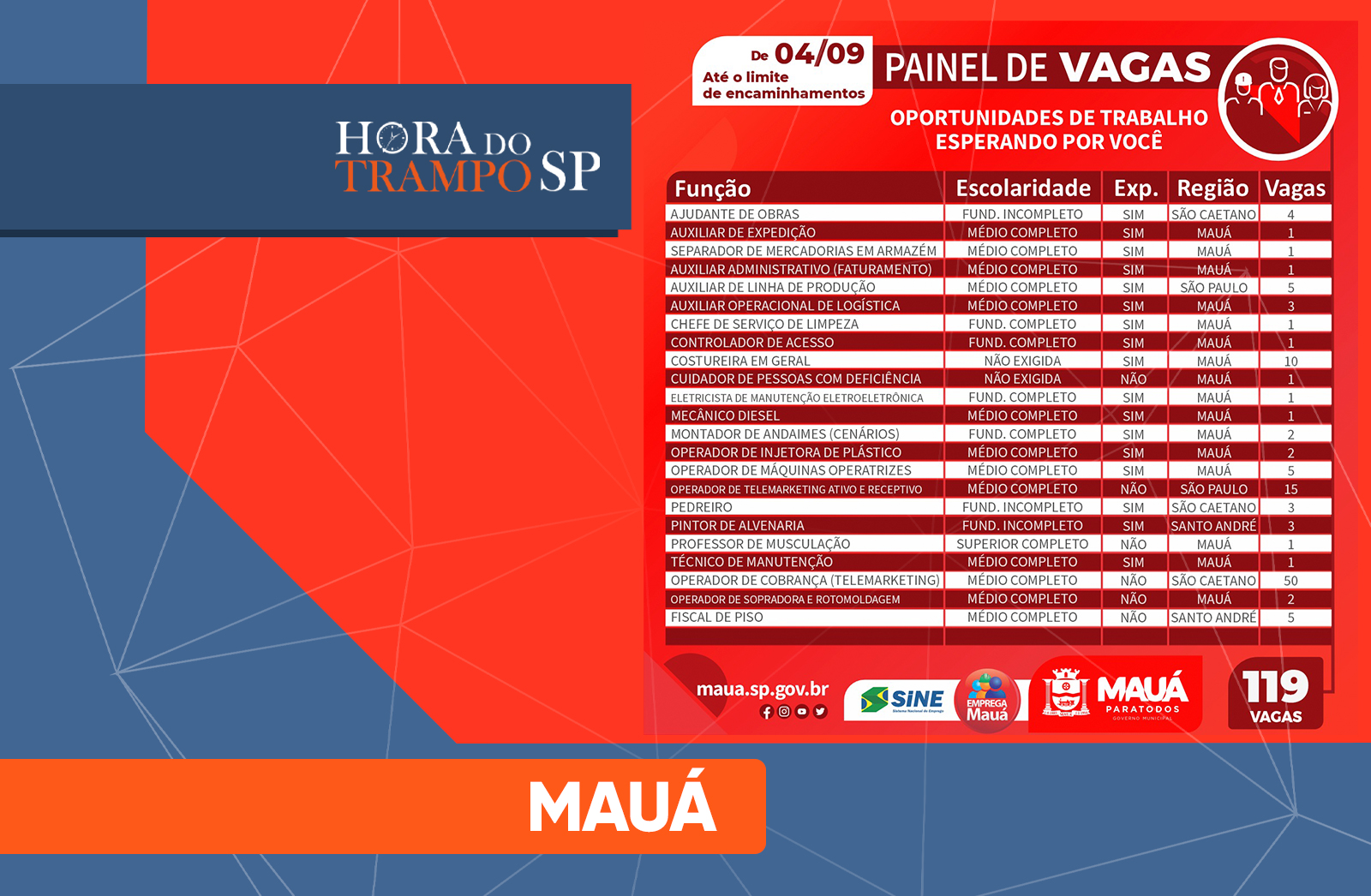 HORA DO TRAMPO MAUÁ: CONFIRA AS VAGAS DE EMPREGO DISPONÍVEIS