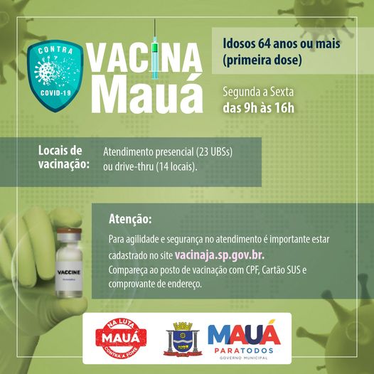 Nesta sexta-feira, das 9h às 16h, Mauá começa a vacinar com a primeira dose contra o coronavírus os idosos de 64 anos. A imunização será feita nas 23 Unidades Básicas de Saúde (UBSs), e em 14 delas será no sistema drive-thru, de segunda a sexta. Até está terça-feira, Mauá já havia aplicado 69.764 doses da vacina contra o coronavírus. 45.109 receberam pessoas a primeira dose e 24.655 a segunda.