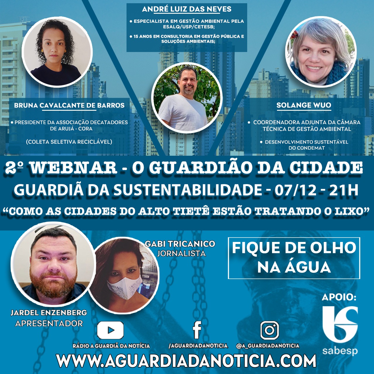 O projeto foi feito com a participação de especialistas do setor de lixo, CONDEMAT (Solange Wuo, Coordenadora Adjunta de Câmara Técnica de Gestão Ambiental) e a responsável pela coleta seletiva de lixo da Região do Alto Tietê (Bruna Cavalcante de Barros – Presidente da Associação de Catadores de Arujá Cora) e apontamos medidas de proteção dos rios que passam pelas cidades, além da mediação da jornalista responsável da A Guardiã da Notícia.