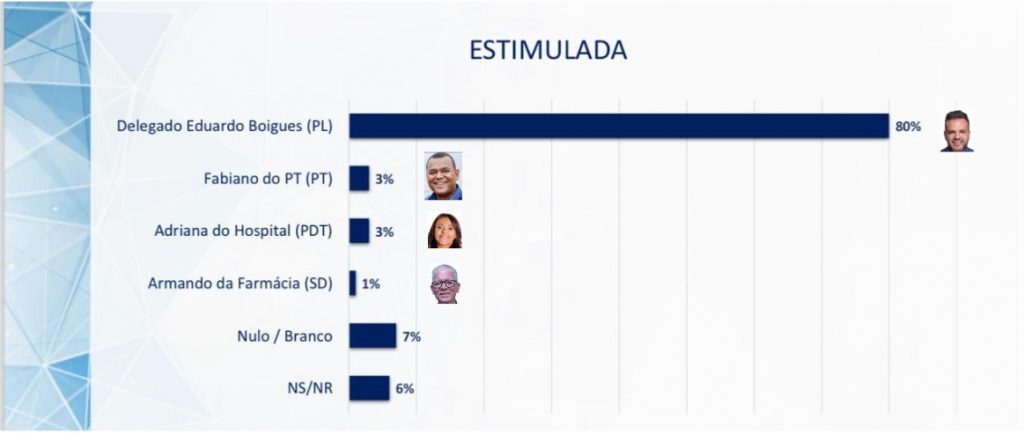 Uma pesquisa eleitoral realizada pela Real Time Big Data em Itaquaquecetuba aponta o delegado Eduardo Boigues, candidato à reeleição pelo PL, como o franco favorito na corrida pela prefeitura. Boigues lidera com impressionantes 80% das intenções de voto, enquanto os demais candidatos, somados, não chegam a 10%.
