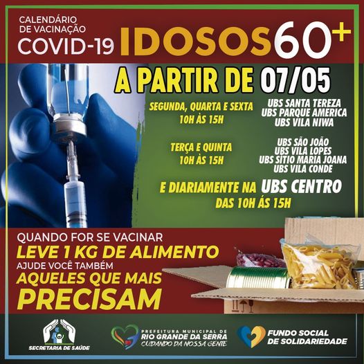 O grupo de idosos com 60 anos de idade ou mais começa a ser imunizado com a primeira dose em Rio Grande da Serra nesta sexta-feira. As vacinas começaram a ser aplicadas às 10h, na UBS Central e vai continuar diariamente. Nas UBSs Santa Tereza, Vila Niwa e Parque Americam as aplicações serão sempre nas segundas, quartas e sextas-feiras.