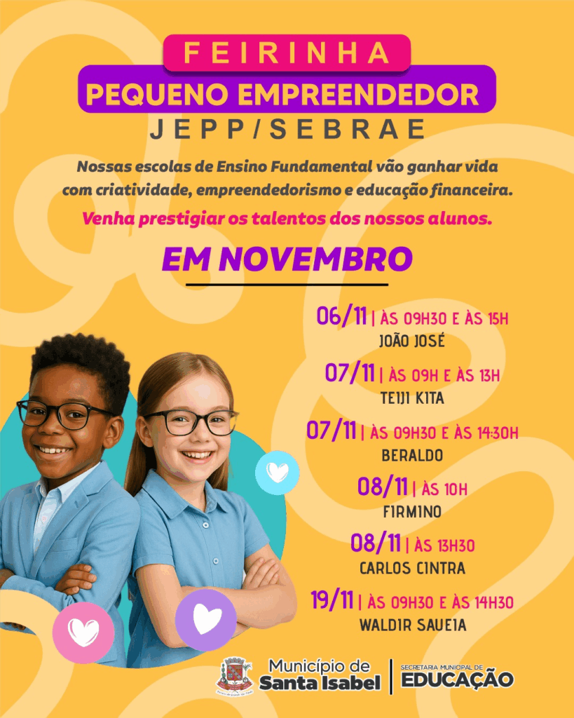 A Prefeitura de Santa Isabel, por meio da Secretaria Municipal de Educação, em parceria com o SEBRAE, realiza neste mês a Feirinha do Pequeno Empreendedor JEPP/SEBRAE, uma ação que incentiva os alunos do Ensino Fundamental a desenvolverem criatividade, responsabilidade e visão empreendedora.