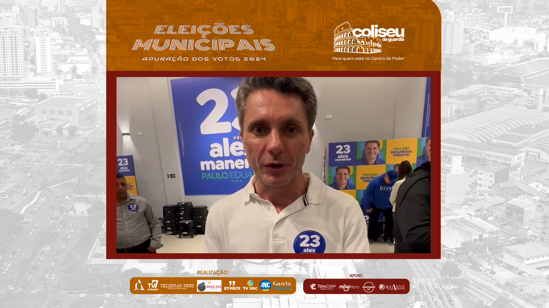 Após ir para o 2* turno em São Bernardo do Campo com 26,53% dos votos contra 28,64% de Marcelo Lima, Alex Manente comenta a expectativa para a próxima fase eleitoral no comitê de sua campanha com a presença de apoiadores e vereadores eleitos.