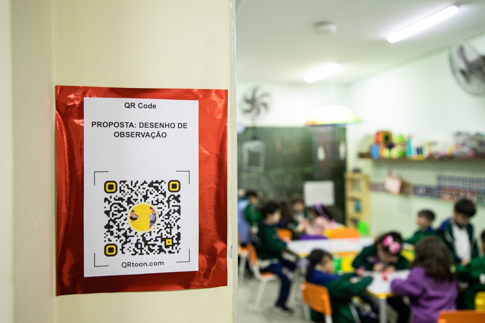 A escola distribuiu QR Codes em murais da escola para os pais acessarem as atividades feitas pelos alunos.