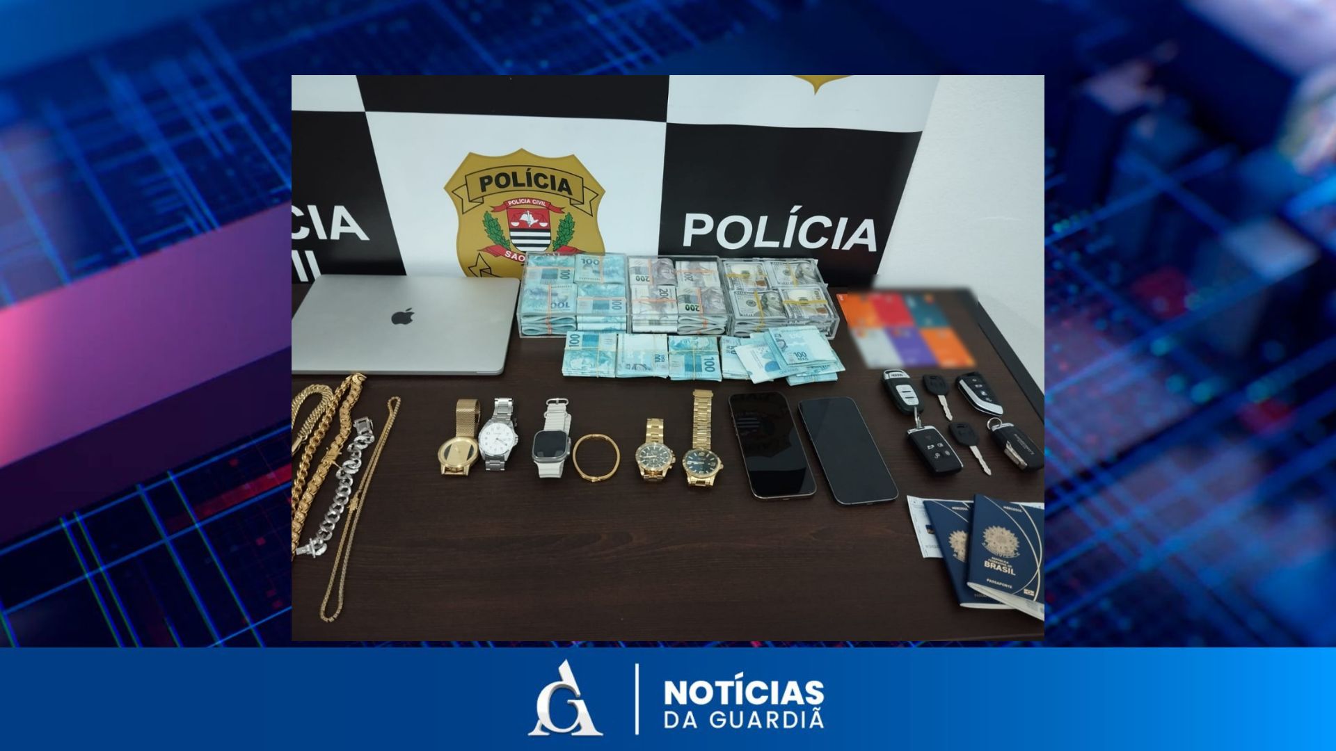 Nos endereços, os policiais apreenderam duas caixas de dinheiro falso (usado na divulgação dos jogos), quatro carros de luxo, 19 cartões bancários, dez aparelhos eletrônicos e 25 jóias e relógios.