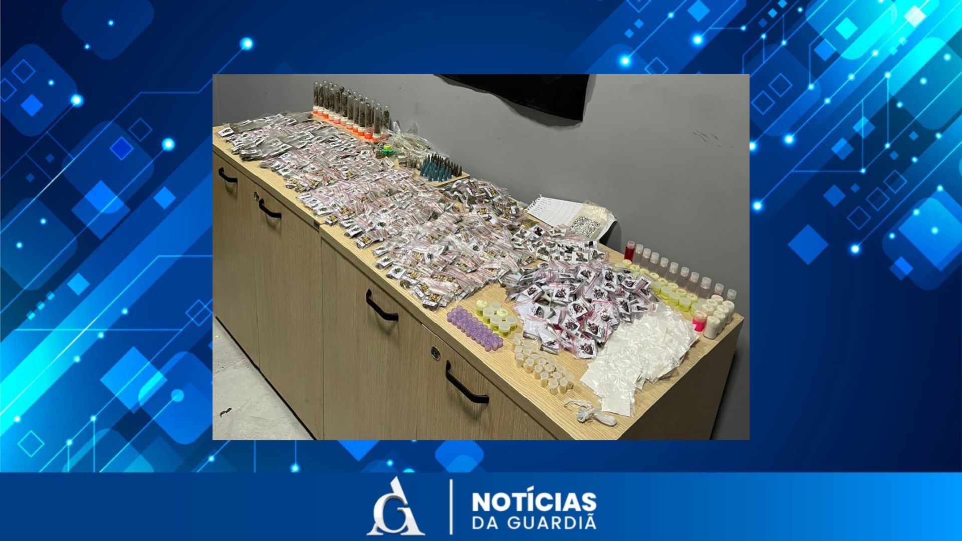 Na busca, foram encontrados 175 pedras de crack, 401 eppendorfs de cocaína, 104 pacotes de cocaína, 589 porções de maconha, 11 frascos de lança-perfume e R$ 33,50 em dinheiro. Ambos os suspeitos confessaram o envolvimento no tráfico.