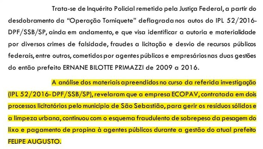 A Delegacia Seccional de São Sebastião instaurou um inquérito para apurar crimes de corrupção e lavagem de dinheiro que envolvem políticos, empresários e outros agentes públicos, com investigações iniciadas há seis anos pela Polícia Federal e recentemente assumidas pela Polícia Civil; no dia 10 de setembro, o delegado Tadeu Castro solicitou mais prazo para a conclusão do caso, que acumula mais de 55 mil folhas e tramita em segredo de Justiça, sendo citado na denúncia protocolada na Câmara; o inquérito é desdobramento da Operação Torniquete deflagrada em 2017 pela PF na gestão do ex-prefeito Ernane Primazzi, com evidências de continuidade do esquema no governo Felipe Augusto, conforme relatório do delegado da PF de abril de 2021, que indicou recebimento de propina da Ecobus e Ecopav em troca de contratos e privilégios, além de um esquema de fraude nas pesagens do lixo pela Ecopav, que envolveu o ex-secretário Gelson Aniceto, suspeito de ter recebido um carro como propina; a demora no processo se deve a impasses judiciais envolvendo competências de diferentes órgãos e transferências do caso da Polícia Federal para a Polícia Civil, com o inquérito apenas sendo instaurado na Delegacia Seccional de São Sebastião em junho deste ano; a Secretaria de Segurança do Estado informou que as investigações continuam em sigilo e a reportagem não obteve respostas do prefeito Felipe Augusto, do ex-secretário Tota ou da Ecopav, que teve falência declarada no ano passado.
