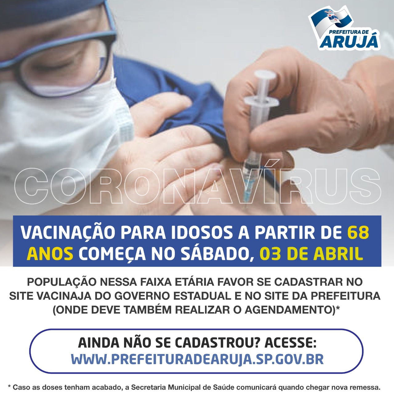 A campanha de vacinação contra a Covid-19 segue neste sábado, agora atendendo a idosos a partir dos 68 anos de idade em Arujá. A imunização acontece no ginásio Habib Tannuri, que fica na rua Maranhão, 386, para pessoas desta faixa etária ou acima, que tenham se cadastrado nos sites do vacina já do governo do estado e da Prefeitura de Arujá e que tenham agendado o dia e hora para a tomada da vacina. O link para o agendamento no site da Prefeitura está no texto deste podcast.
